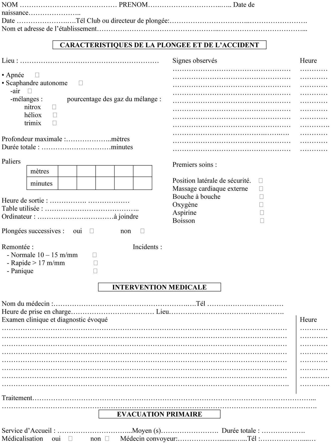 Fiche d'évacuation de plongeur.